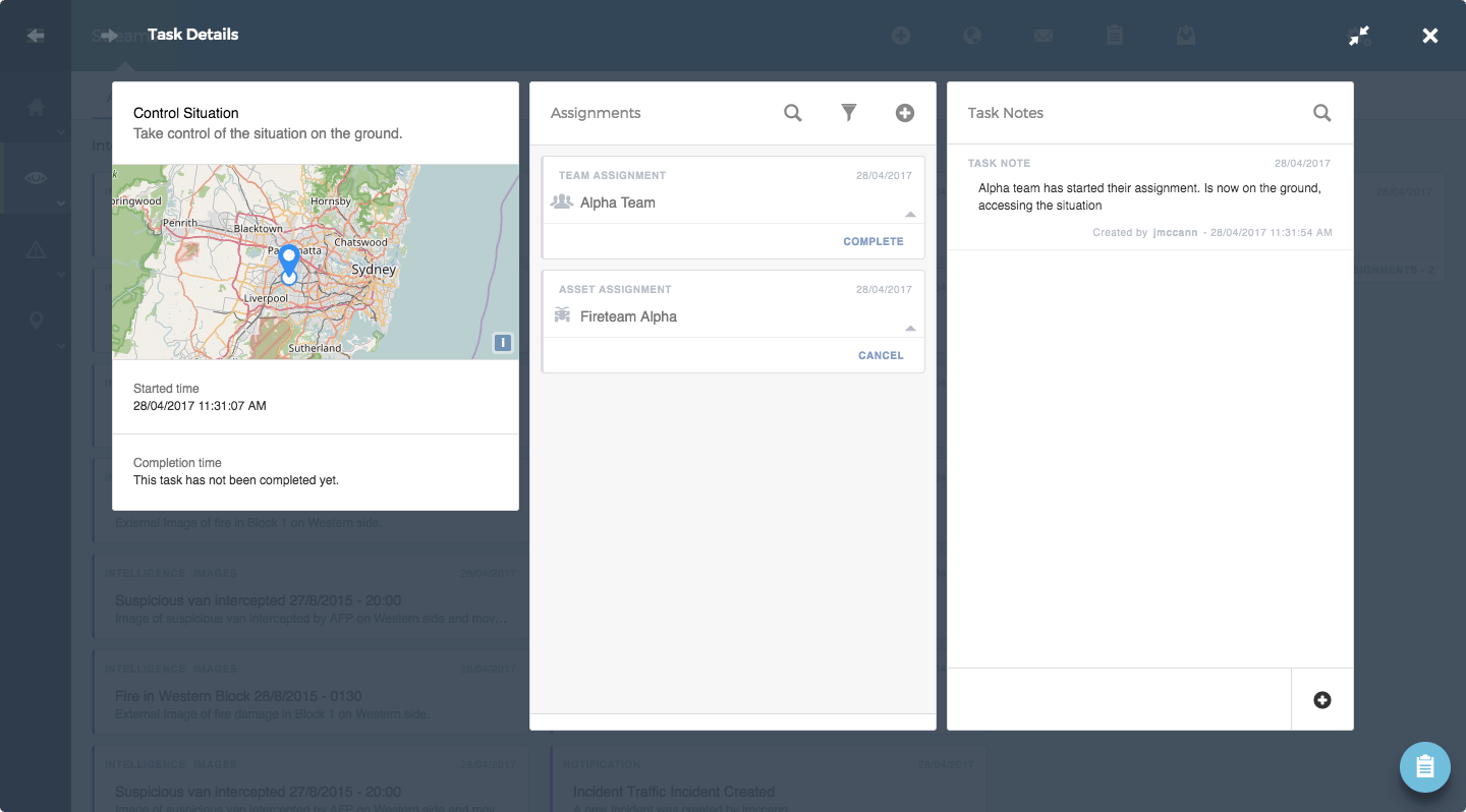 Create tasks for your users, teams and assets that will help in the resolution of an incident. Watch as they report progress, communicate with them while they're in the field, and assign more people to help them as they request further assistance.